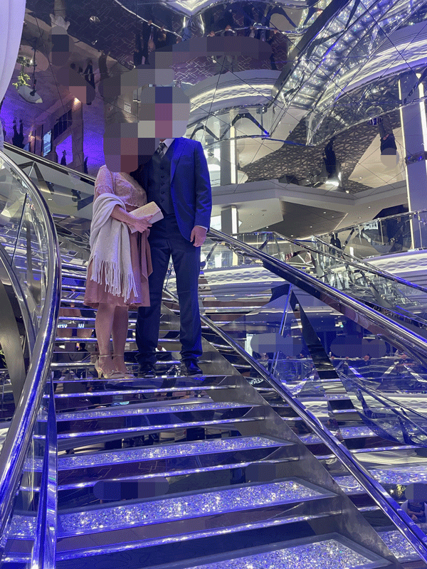 MSCベリッシマのメインスポットとも言える、スワロフスキーの階段があり、フォーマル衣装で写真を撮る人がたくさん集まっていました。